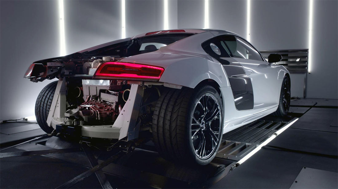 With a kerb weight of 1,570 kg, double wishbone front and rear suspension and standard carbon ceramic brakes it’s also a technical feast of all that Audi’s learned in its 14-year Le Mans campaign.